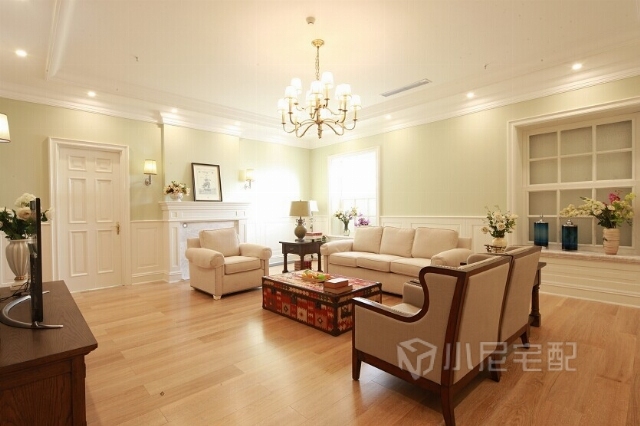 北美的都市生活,簡潔爽朗的空間布局,線條洗練,淡色系墻面,天花板、沙發,深色系的電視柜相得益彰,賦予空間平衡之美;舒適開闊大方的家居格調,給人帶來清爽明快的視覺感受,久看而不膩。家裝家具一體價:14萬。