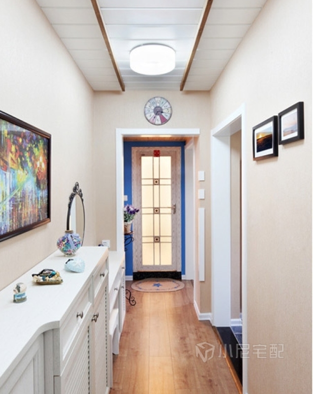 狹長的走廊用來放置儲物柜和梳妝臺,無處不在的裝飾畫成為家中的一道道靚麗風景。