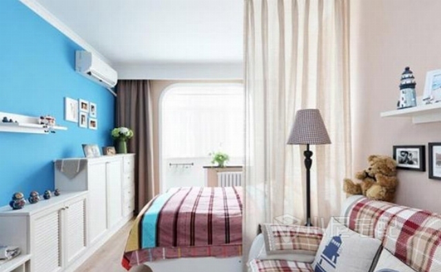 客廳與臥室只用了一扇紗簾來隔開,軟隔斷在保證隱私的前提下,也讓空間具有更好的連通性。粉刷了藍色墻漆的墻面顯得活潑溫雅,一排連續的儲物柜讓收納有了足夠的空間。