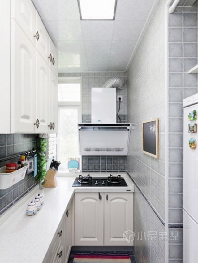 廚房不大,而白色的櫥柜能讓空間顯得更加明亮,似乎在視覺的感受上寬敞了不少。對于油煙重的廚房來說,鋪貼瓷磚相對來說更易清理,地上鋪一塊小地毯,也能有效防滑。從收納的角度來講,寬敞的臺面、充足的收納柜加上有效的立面收納,小小廚房也可以有強大的收納功能。
