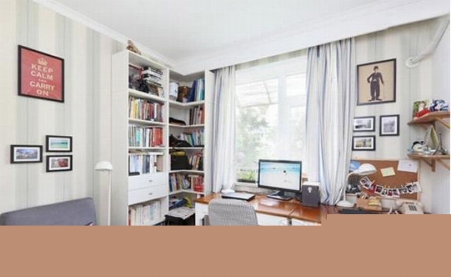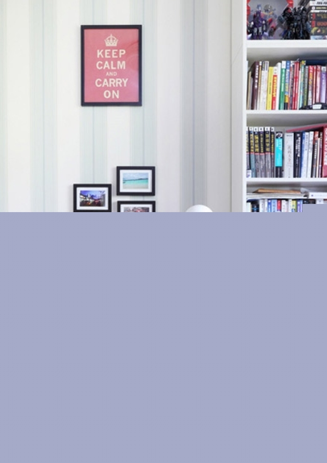 書房是一個獨立的房間,淺淡的黃綠色條紋壁紙讓空間變得清新起來,兩張書桌并在一起就成了一個雙人工作臺,轉角處的書架上密密麻麻擺滿了各種書籍,一把小凳子讓高處的書本也可以拿得到,窗外陽光正好,房間里灑滿甜蜜。