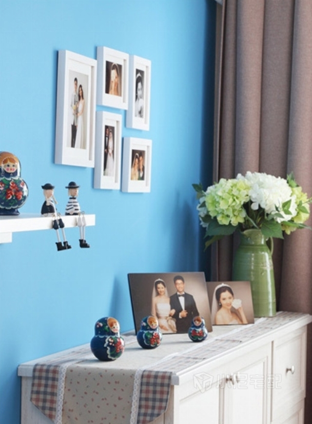 臥室里的一角。儲物柜上鋪了一塊小清新風格的桌旗,既防塵又美觀。桌面上的相框以及照片墻,無不體現著夫妻二人的感情甜蜜。