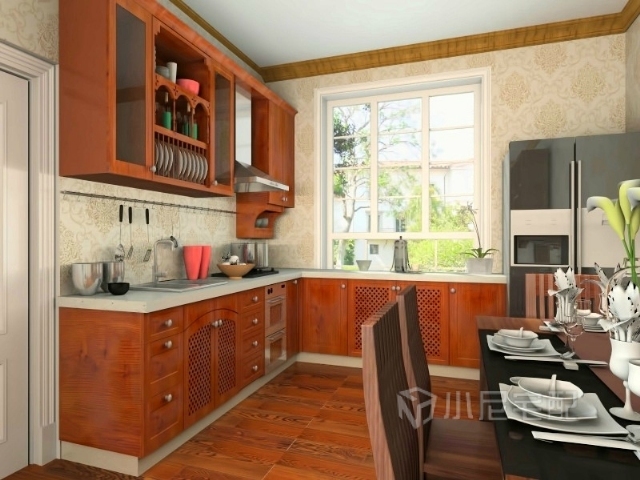 廚房是敞開式的,選擇了搭配家具的木紋,和整個房間的顏色相互呼應(yīng)。