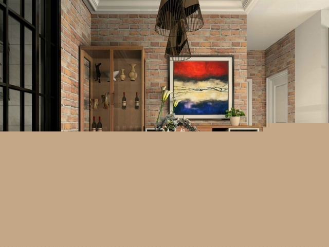 客廳墻面的板磚充滿氣氛感,布藝沙發和實木電視柜構成了復古風格的最佳搭配