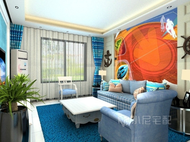 藍白為主調(diào),色彩對比強烈的背景墻增添生機。