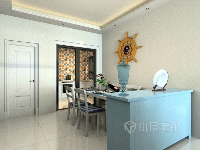 空間主要以藍色白色為主調(diào),精美的裝飾物使空間有錦上添花的作用,使人眼前一亮,整個氣氛既溫暖又休閑。