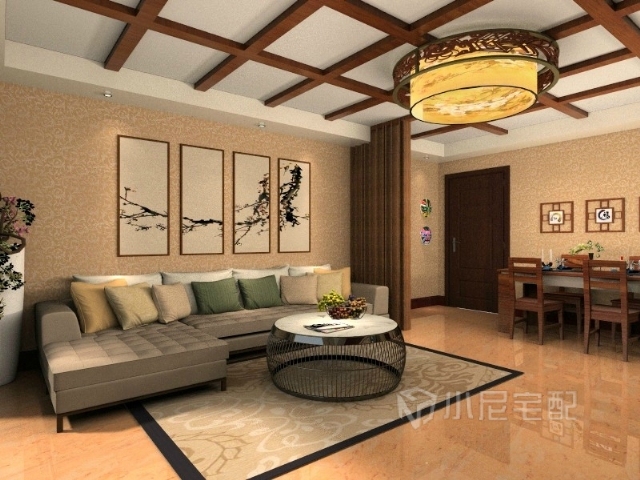 木質橫梁與格柵的中國元素運用到吊頂,電視墻,以及隔斷