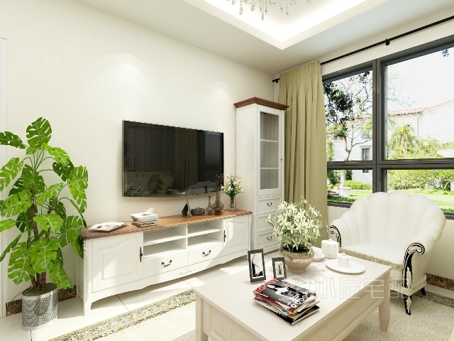 白色田園風(fēng)格的電視柜組合,綠色的植物增加整個(gè)空間的活力。
