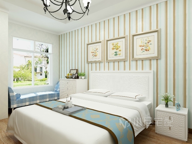 白色的波浪紋的床頭,黃色裝飾畫,淡綠色條紋壁紙,藍色格子的軟塌,搭配出最舒適的組合。