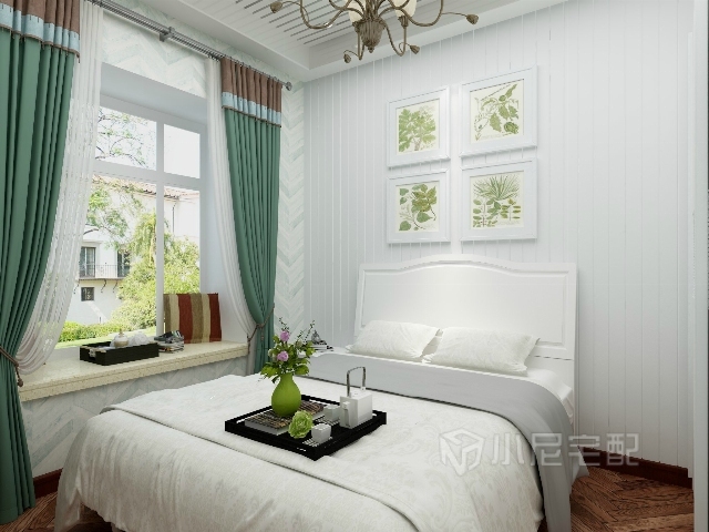 綠色的窗簾,白色的背景墻,綠植裝飾畫,營造自然清新的環境。