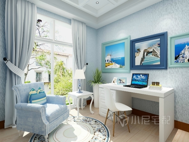 白色的書桌椅,藍色的沙發,大幅的希臘風景裝飾畫,既浪漫又有學習工作的靜謐的氛圍。