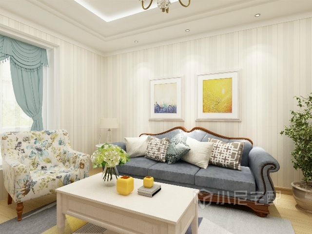 歐式布藝沙發,色彩鮮艷的裝飾畫,基本配色為藍色和黃色,顯得十分和諧。