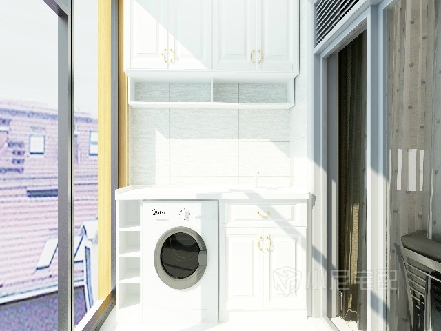 陽(yáng)臺(tái)、放置洗衣機(jī)加洗臺(tái)池看上去更加美觀,實(shí)用性方便、吊柜可以放些洗衣液。看上去簡(jiǎn)潔美觀。