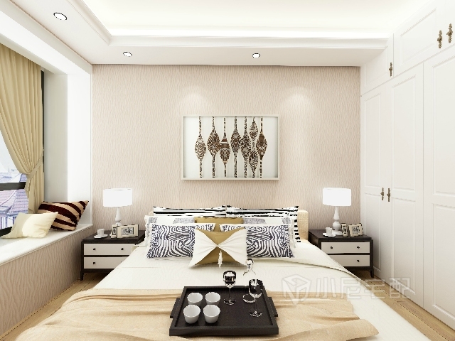 次臥也是以暖色壁紙搭配、床頭又掛現(xiàn)代裝飾畫、時(shí)尚又大氣。