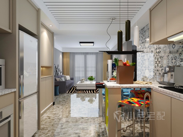 由于原始戶型廚房較小,所以經過墻體拆改,將餐廳廚房,門廳搭配到一起,整體顏色搭配采用小尼地平線系列,與花磚形成強烈對比,使整個空間更溫馨,更出彩