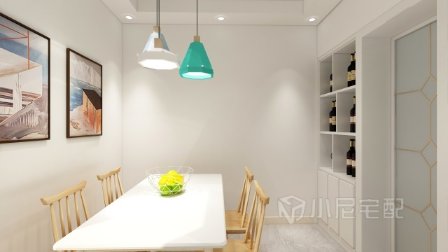 餐廳用酒柜及推拉門巧妙把衛(wèi)生間門和廚房門隱藏起來,使整個餐廳成為一體