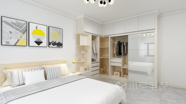 次臥室空間較大,放置轉角衣柜配合原木色床,使空間顯得緊湊而又不擁擠