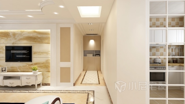 客廳大理石背景墻配合白色烤漆邊框,吊頂采用歐式大樣石膏線,一切盡顯豪華范