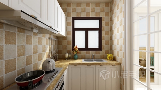 廚房方格瓷磚配合白色吸塑門板,一切顯得協調自然