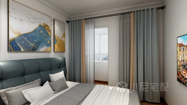 主臥室孔雀藍色床頭配合同色系窗簾干凈整潔
