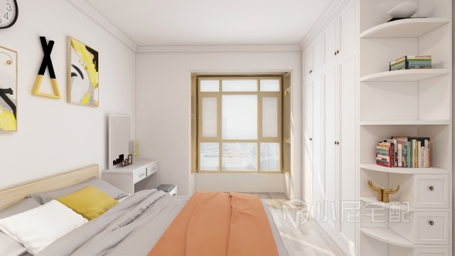 主臥室放置白色衣柜及妝臺配合橙色床品,清新自然