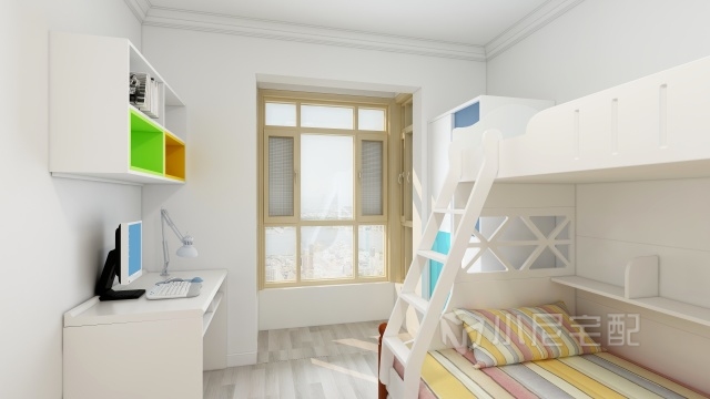 兒童房放置上下床節約空間,套色書桌配合藍白衣柜,給孩子一個多彩的空間