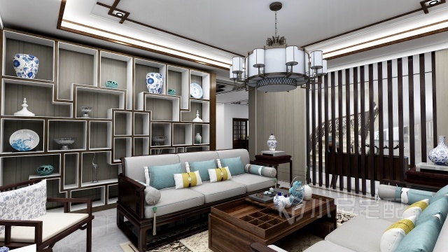 這是一個以瓷元素為裝飾元素的新中式風格的別墅的一層,包括客廳、餐廳、視聽室、廚房、保姆房以及車庫。