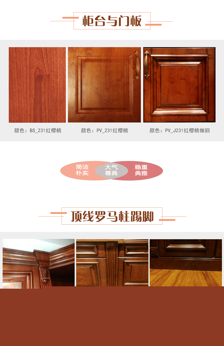 | 細節描述 | 客廳門板造型上采用古樸大氣簡約線條,顏色秉承美式家具鐘愛的具有歷史感的紅櫻桃做舊處理,搭配咖啡古色的美式拉手。注重黃金比例設計,巧妙的柜體結構形成對稱,強調家具帶給人的平和感,并且把現代的功能納入其中,裝飾效果好,穩定性強,儲物更加方便。 |